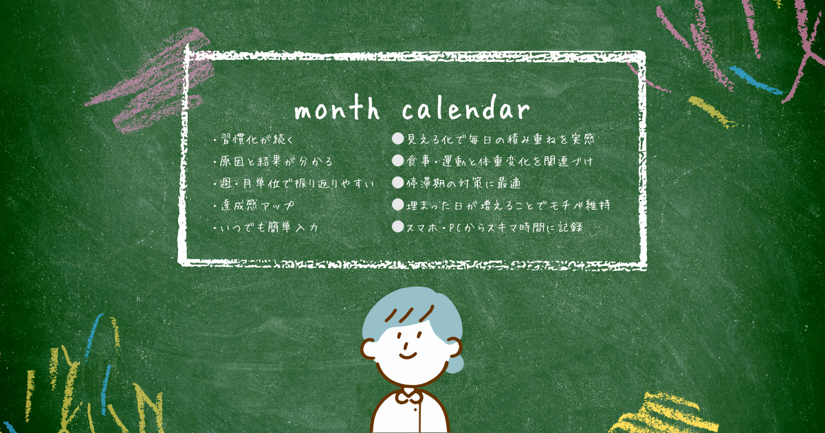 - 月カレンダー を使って毎日の体重・運動・メモを記録することで、数値の変化を客観的に把握できる。